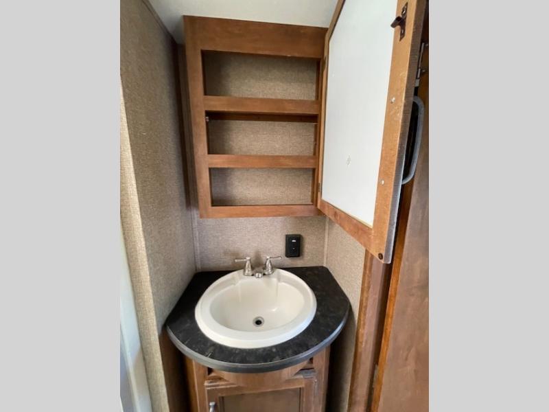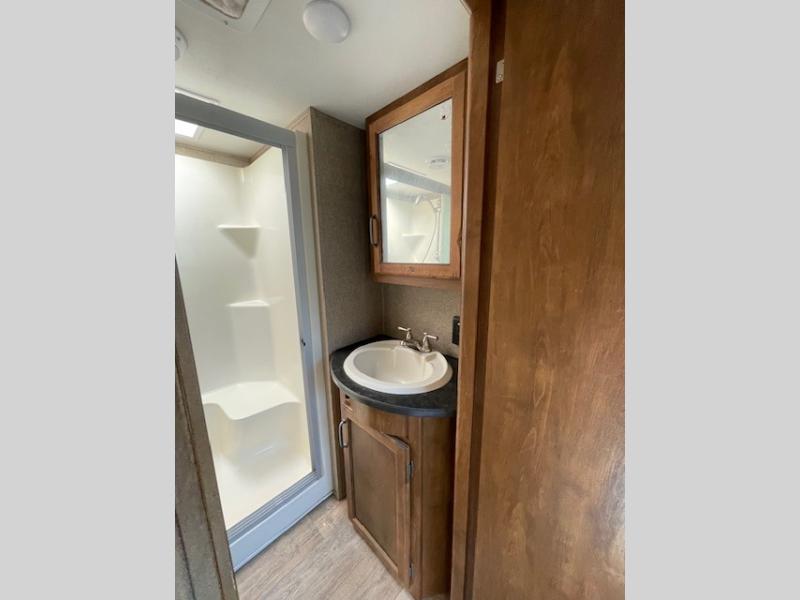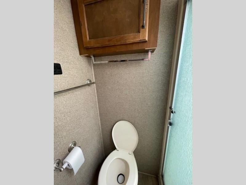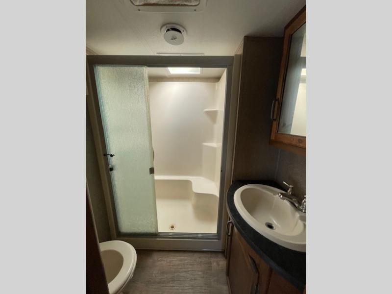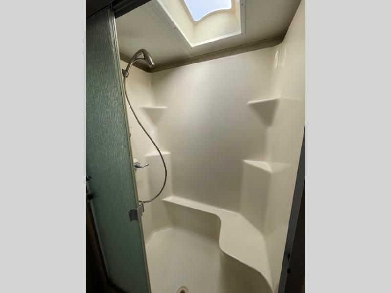 Step up to a side aisle bath and front private bedroom. The bath features a toilet, sink and tub/shower with skylight. There is also storage above the toilet, and above the sink too.