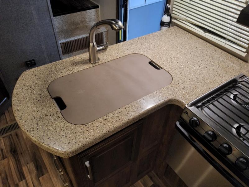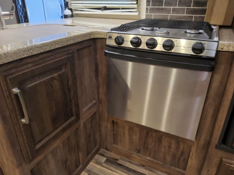 As you step into the combined living and kitchen area you will see an entertainment center with a 50" LCD TV for your enjoyment. There is also an 8 cu. ft.refrigerator, three burner range and double kitchen sink. A super sofa slide out on the opposite side features plenty of space to gather for a meal or conversation, or have a place to sit and enjoy watching TV. There is also a pantry located off to the side for more storage.