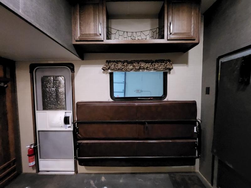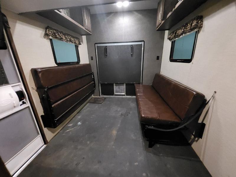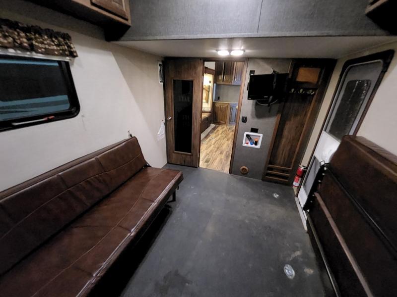 The cargo garage features a 42" x 92" loft that the kids are going to love. There is a spaced prepped for a washer and dryer if you choose to add those conveniences, and a closet for storage plus overhead cabinets above two flip sofas. Use the side man door once the rear ramp is closed to access the garage space easily.
