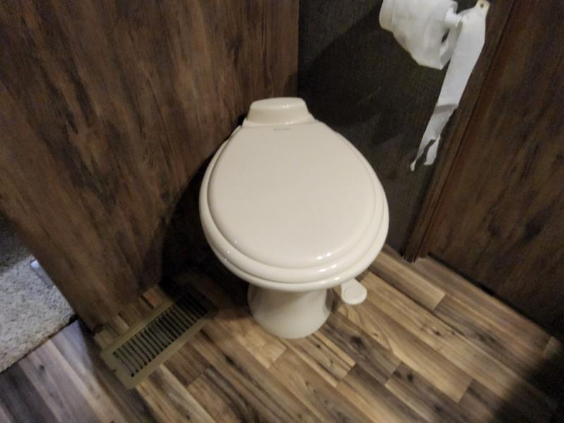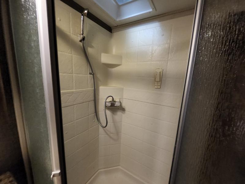 Step up to a side aisle bath and front bedroom. The bath features a neo-angle shower, toilet and sink.