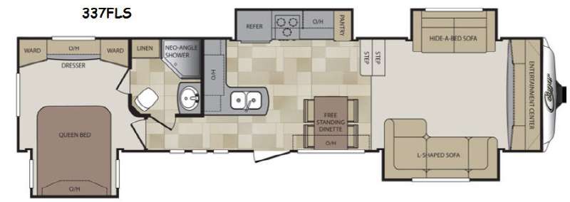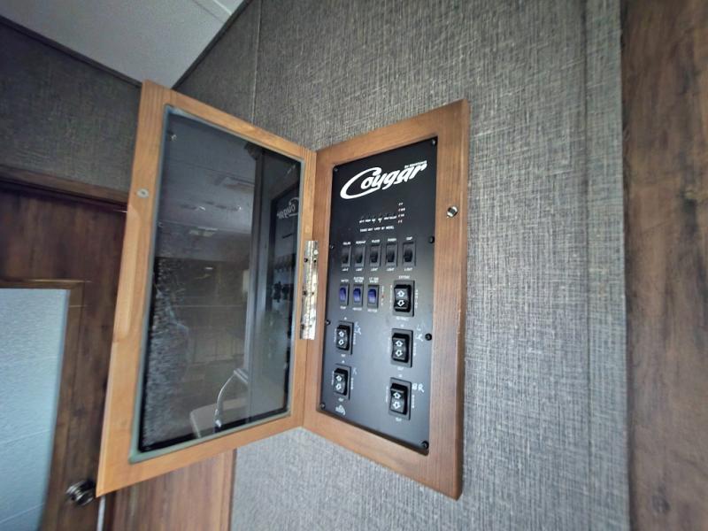 This Cougar fifth wheel 337FLS by Keystone RV features quad slides, a front living area, and rear master bedroom. It also has Auto Leveling and Polar Package Plus.