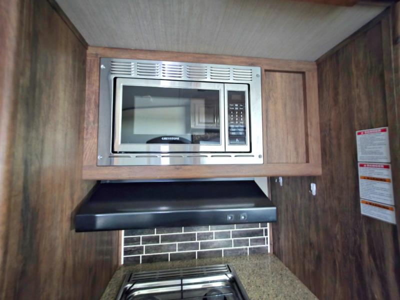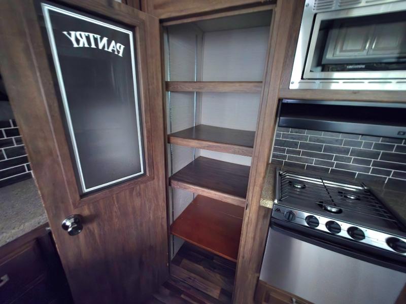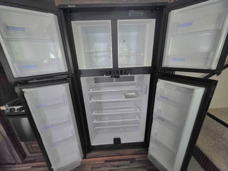 Step inside and find yourself in a spacious retreat with a large center kitchen. There is a free standing dinette to your right as you enter. Straight ahead is an L-shaped counter with double sink, overhead cabinet, and counter space. The slide out features a refrigerator, three burner range, and pantry.