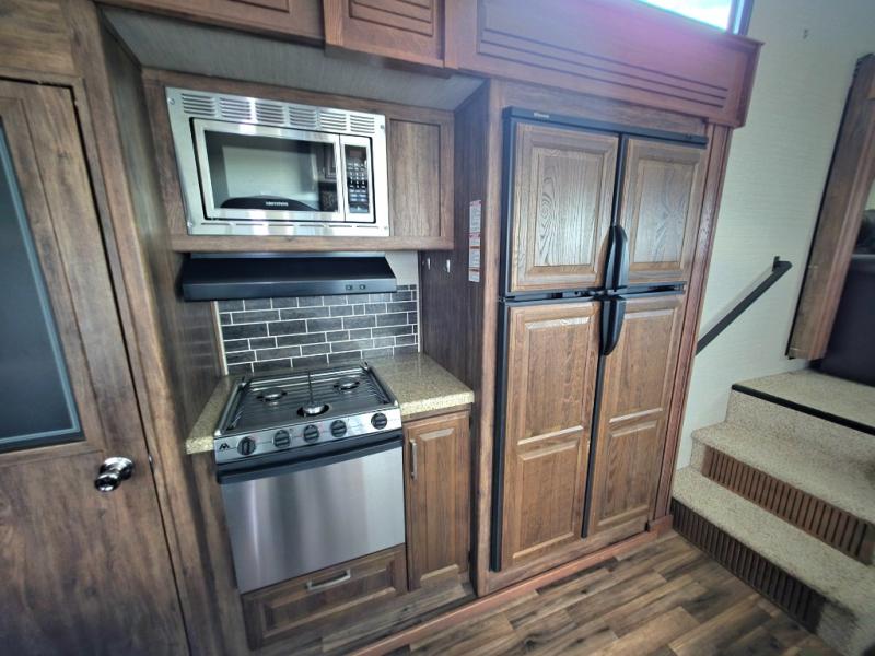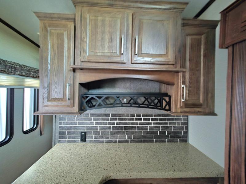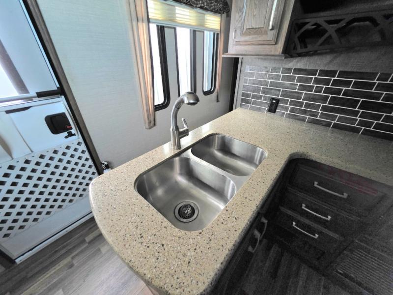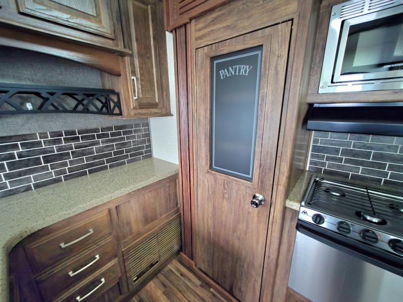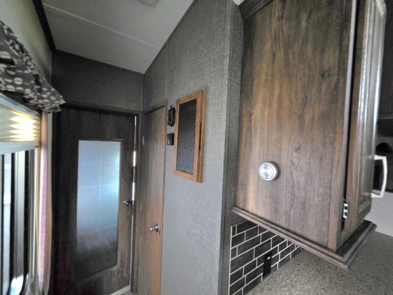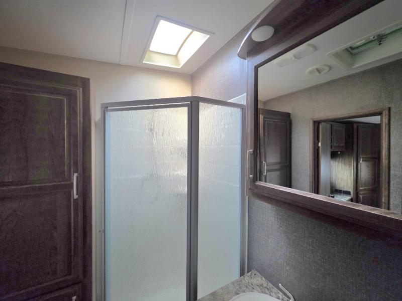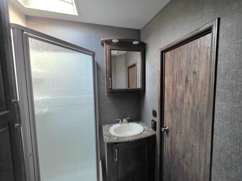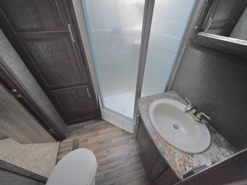 Move to the rear of this fifth wheel and find a full bath with toilet, sink, neo-angle shower, and linen cabinet.