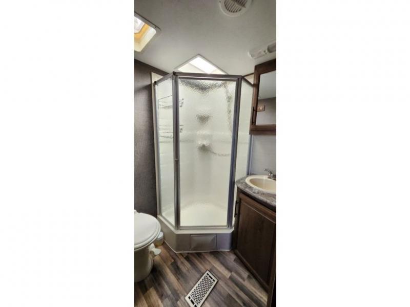 As you enter model 21RBSWE you will find a closet/pantry to the left of the door for convenient storage. Straight ahead is a rear corner bath which provides a neo-angle shower, toilet, and sink.