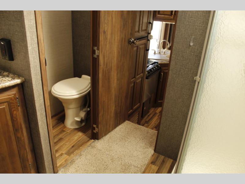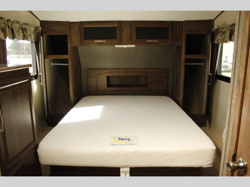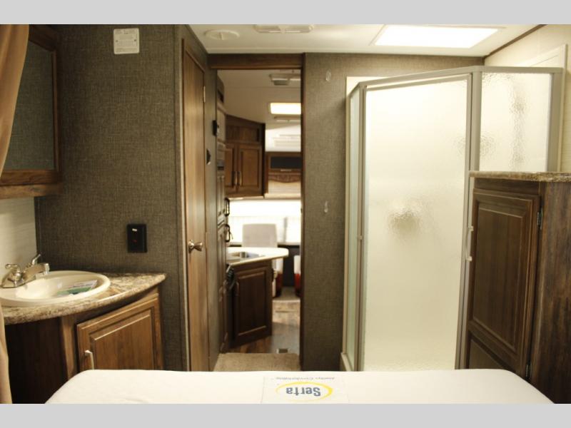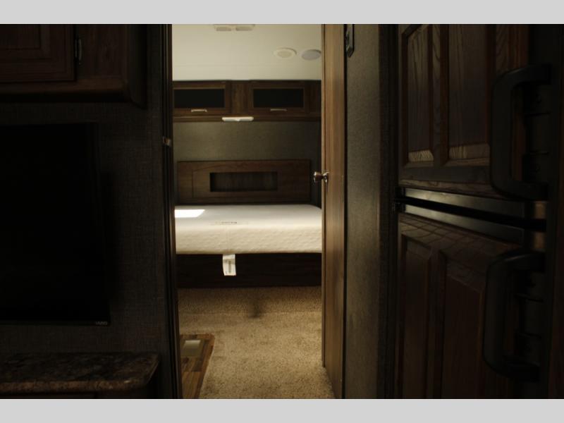 In front take a step up to the master suite featuring a convenient laundry chute at the top. There is a private toilet area on the right with a vanity and sink just around the corner. A neo-angle shower can be found on the left next to a linen cabinet with space for a TV on top. There is a queen bed with overhead storage in the center of the front wall with a wardrobe on one side and nightstand opposite. Enjoy overhead storage above the bed for all of your storage needs, and so much more!