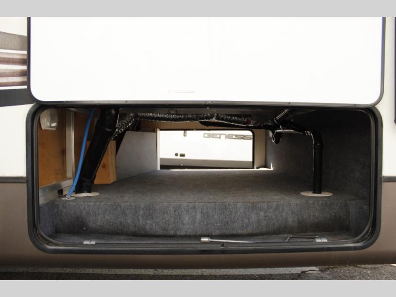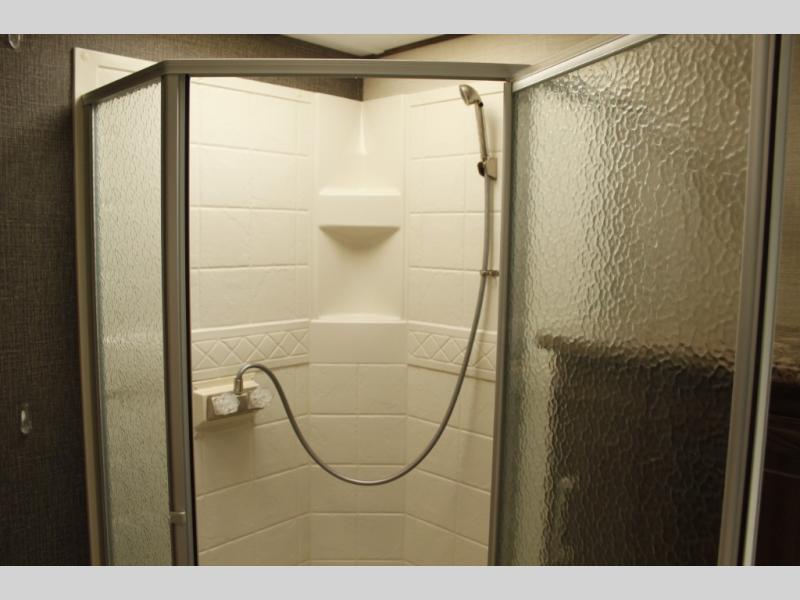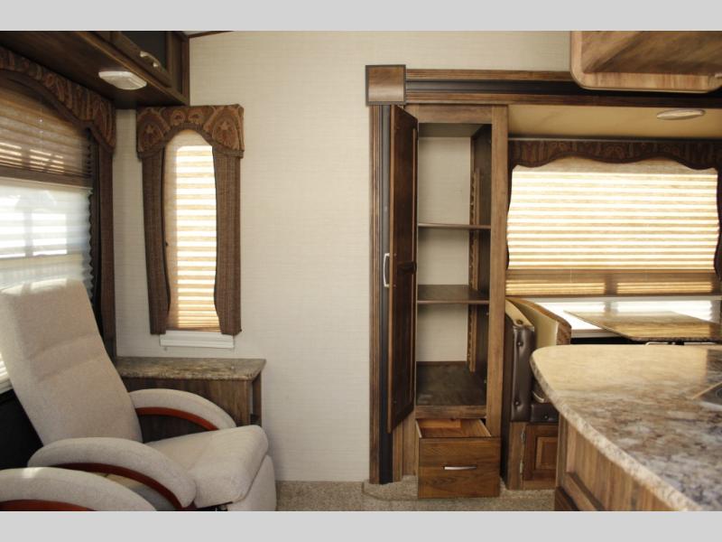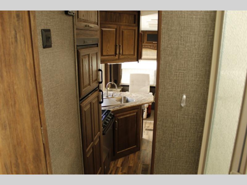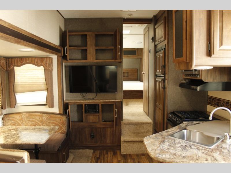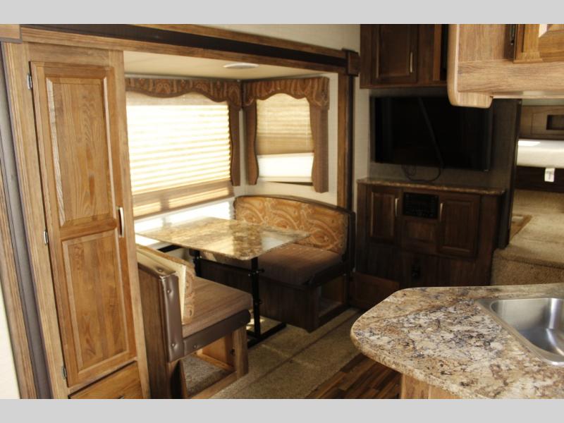The slide out straight in from the door features a booth dinette for dining and also a pantry for canned and dry good storage, plus more. There is an area for an optional 32" TV near the front step up that lead to the master bedroom and bath.