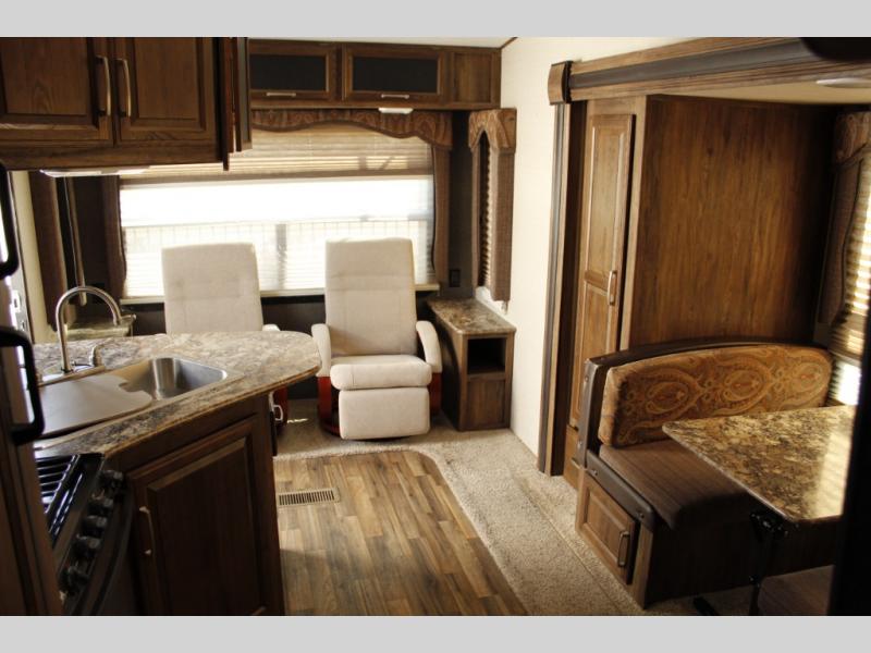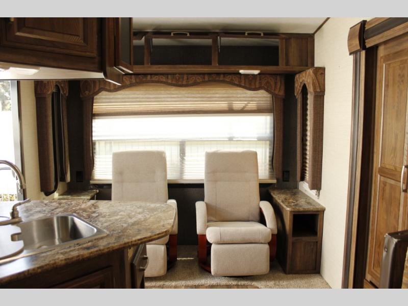 As you step inside model 244RLSWE you will find a rear sofa with overhead storage, plus end tables on either side. You can also choose the optional rocker recliners instead of the sofa still retaining the storage above, as well as the end tables.