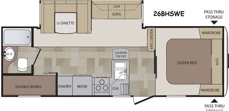 The rear left corner offers bunks that the kids will certainly enjoy and the convenient bath next door provides a toilet, vanity with sink, and tub/shower.