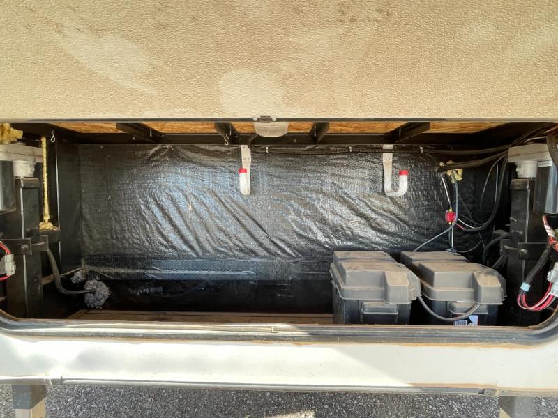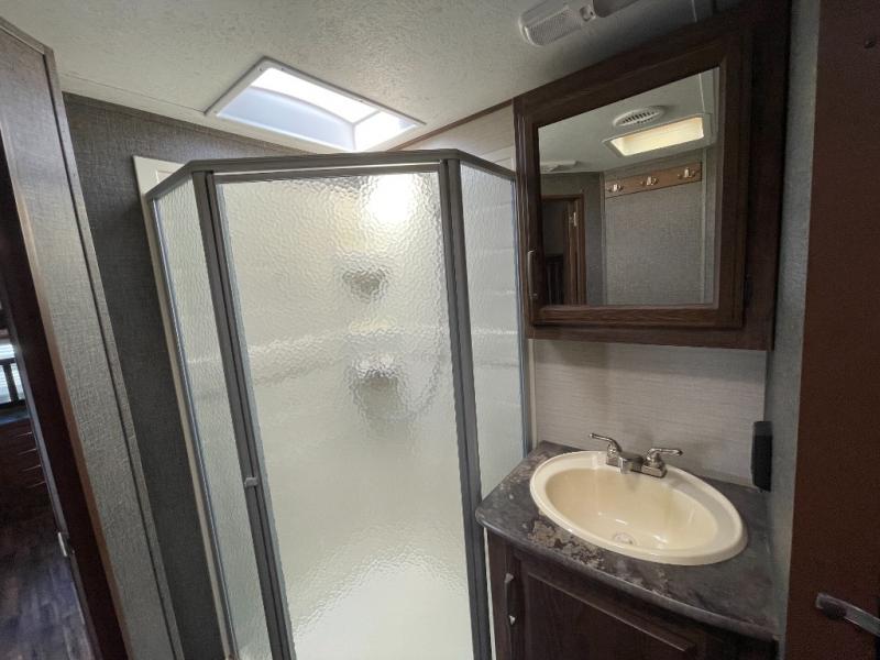 Find a rear kitchen layout in the back left corner providing ample equipment to prepare and cook all of your family's favorite meals and snacks. Starting with a pantry for storage next to the rocker recliner. Next, find a refrigerator and three burner range. As you round the back corner you will find a double kitchen sink and plenty of counter space for prep work and more. There are plenty of drawers and lower cupboards for dishes, pots and pans and silverware to be stored.