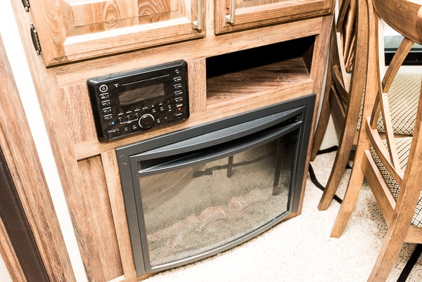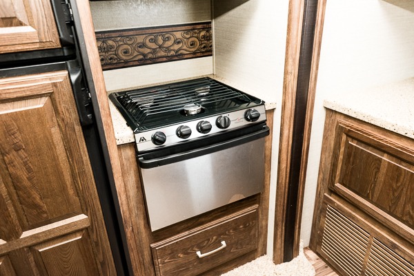 There is a hide-a-bed sofa, refrigerator, and three burner range slide opposite the door side, plus additional counter space along the interior wall that features plenty of prep space and includes a double sink, and overhead storage.