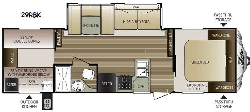 The kids will be happy that they can bring along a few extra friends to camp in this Cougar X-Lite travel trailer by Keystone RV. Model 29RBK features a bunkhouse with quad bunks, a large slide that creates more interior space, plus an outdoor kitchen for cooking and dining outside.