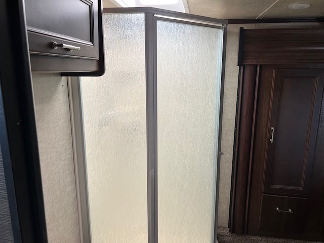 The bath provides an angled shower, toilet and sink. It also has dual entry doors.