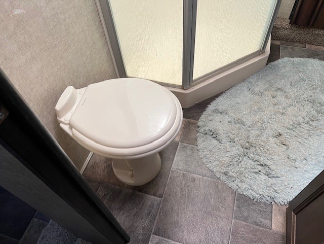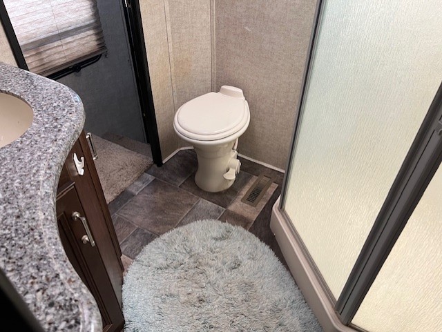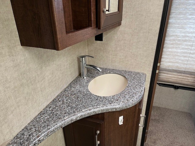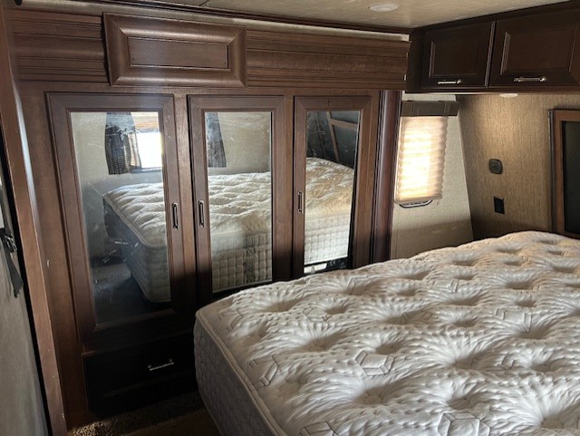 Head up the steps to a side aisle bath and front bedroom with residential queen bed including nightstands on both sides. There is a slide out wardrobe including a linen cabinet that is accessible from within the bath, and an LCD TV mounted on the wall.