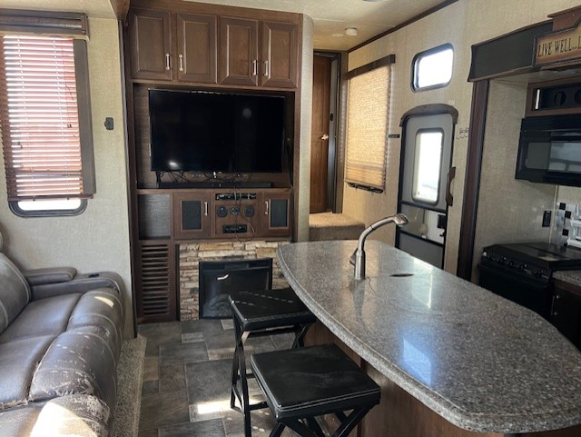 Through the optional glass patio doors in the cargo area you enter the combined kitchen and living space featuring a large slide out sofa on one side, and a second slide with 12 cu. ft. refrigerator and three burner range opposite. There is also an entertainment center for your enjoyment with a 48" TV, a center kitchen island with a double sink, and plenty of counter space.