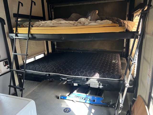 The exterior features plenty of storage, a 30 gallon fuel station, and two awnings on the door side, plus so much more!