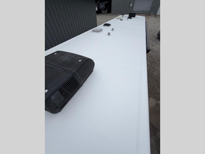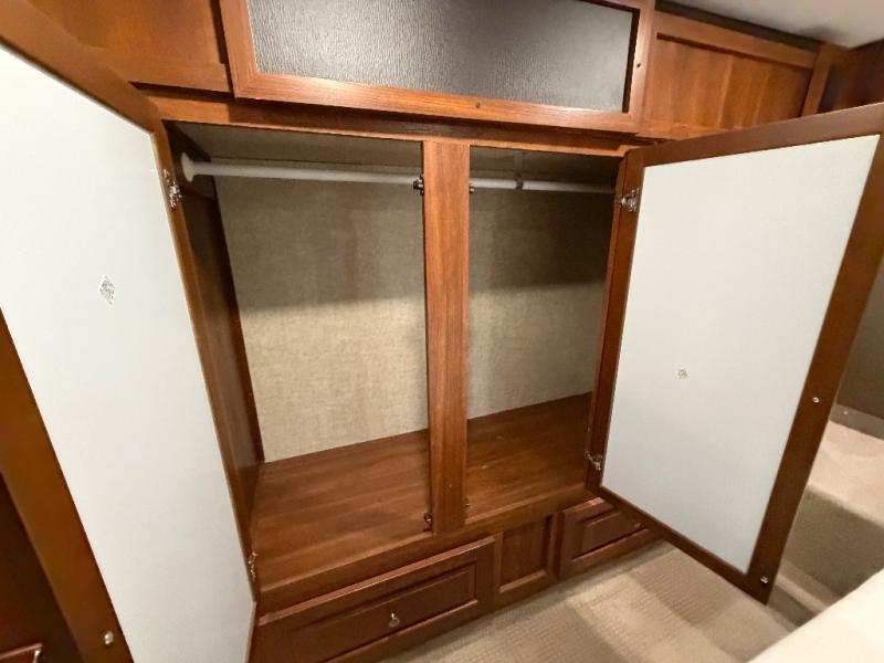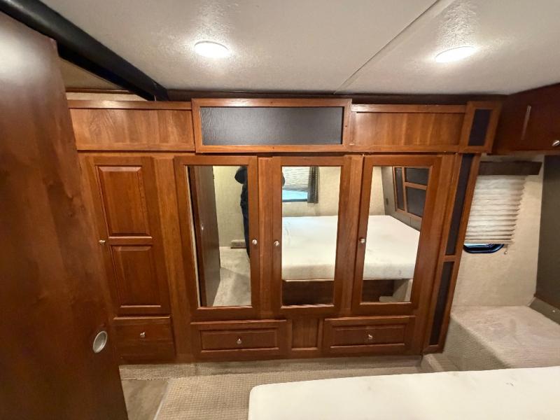 In the bedroom you will sleep comfortably on a residential queen bed or optional Fuzion king with overhead storage, plus storage on both sides of the bed as well. Enjoy watching a little TV when you retire for the evening which is mounted on the wall opposite the bed, plus so much more!