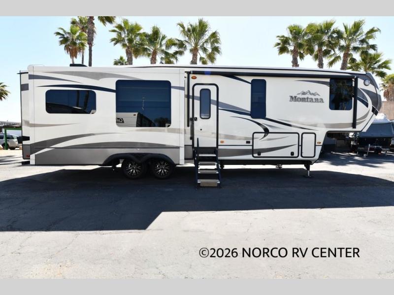 Enjoy camping with family and friends in this rear living Montana fifth wheel by Keystone RV. This unit features triple slides for added interior space, a convenient kitchen island, and an optional king size bed.