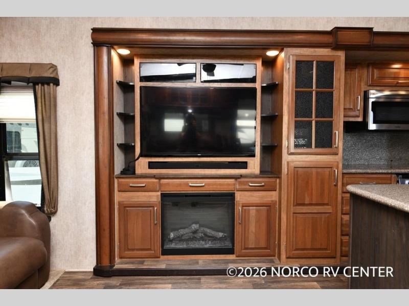 The slide out opposite the door offers an entertainment center with flat panel TV, an optional fireplace, pantry, counter area, three burner range with convection microwave oven, and refrigerator. You will have no trouble preparing and cooking food in this kitchen. There is even a convenient island with double sink, plus food prep space that the cook in the family will love. Along the interior wall find additional storage with a hutch including overhead cabinets, and lower storage too.