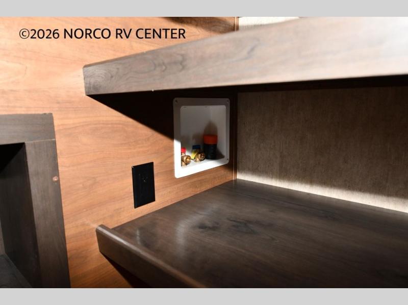 The door at the end of the hall just beyond the bathroom is a spacious master retreat with a queen bed slide out or optional king that has storage underneath either one that you choose. There is a dresser with HD TV above, a seating area, and front wardrobe with a space that has been prepped for a washer and dryer on either side of the wardrobe in front, plus so much more!