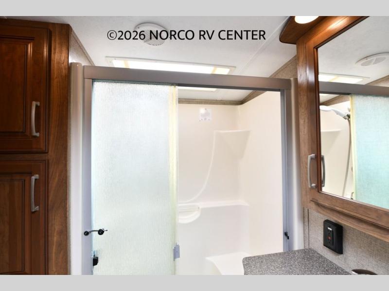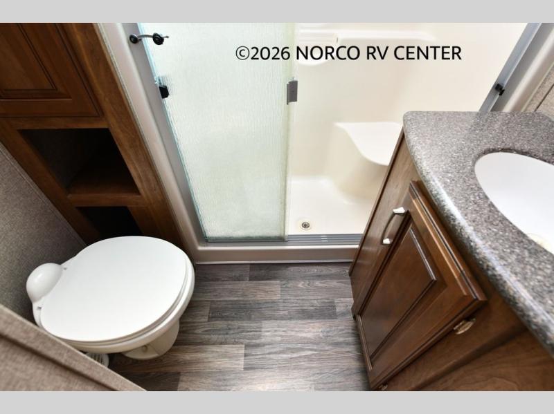 As you enter model 3610RL enjoy the spacious living and kitchen area combined with dual opposing slide outs. There is a dinette with two chairs and optional theater seating for two to your immediate left of the door. Along the rear wall find a sofa with overhead storage and two end tables.