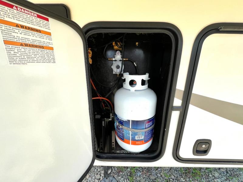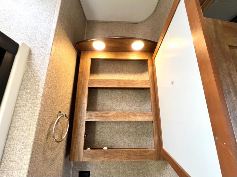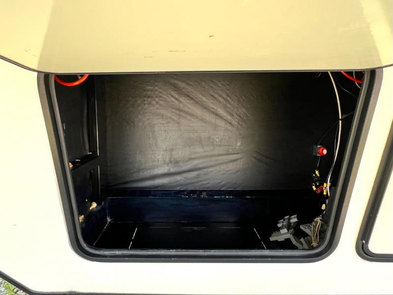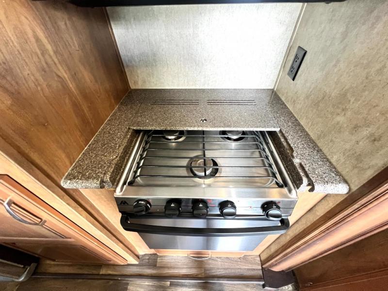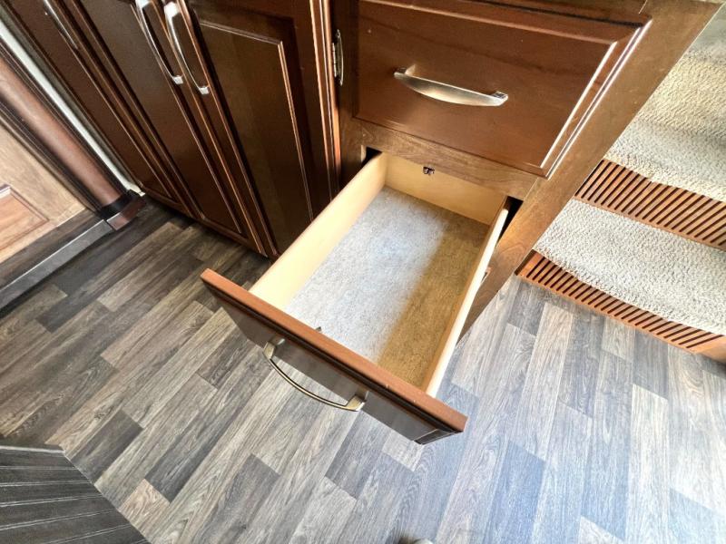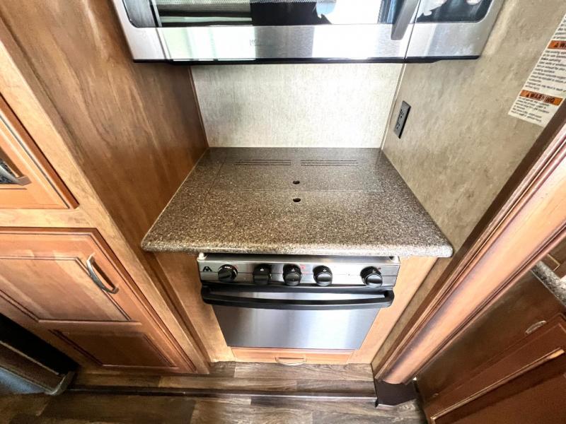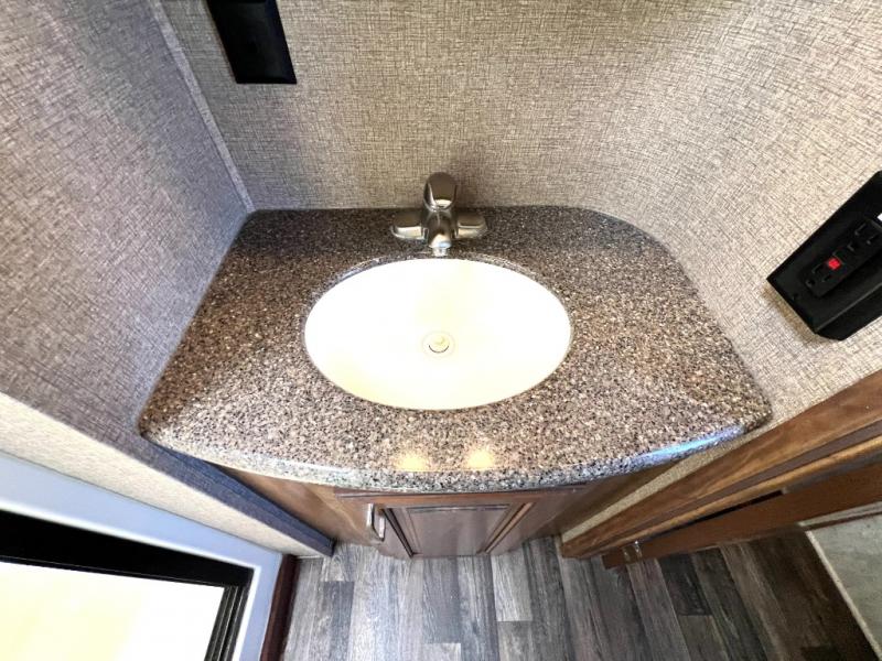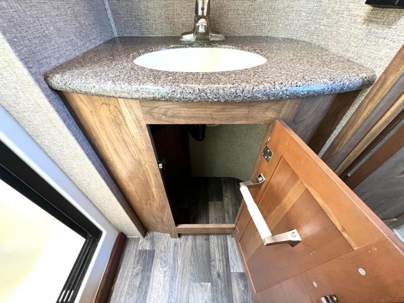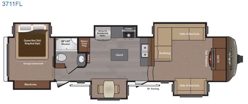 Step inside the centrally located entry door and find yourself in this 3711FL kitchen with dual opposing slides. There is a slide out for the dining table with two chairs to the left of the door. Straight ahead is a counter with double sink, and the slide opposite the door offers a three burner range, counter area, and 18 cu. ft. residential refrigerator. There is a small pantry just off the appliance slide, and a space prepped for a washer and dryer if you choose to add. You will also enjoy the convenient kitchen island which provides added food prep space and more.