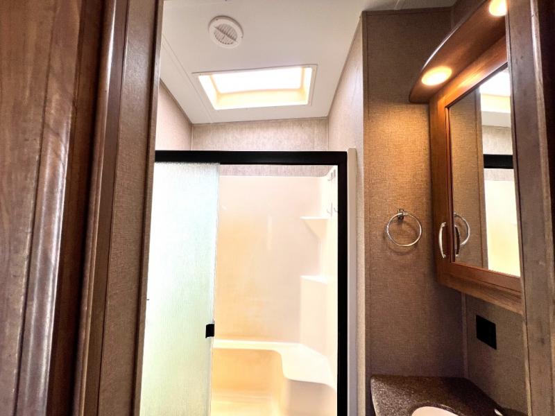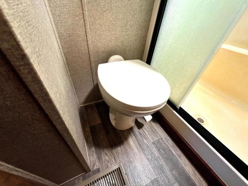 Head toward the rear of this unit and find a complete bath with sink, toilet, and a 48" x 30" shower, plus linen storage. There is also a second outdoor entry right across the hall from the bathroom door which makes it convenient to access when enjoying time outside making it a quick step in to use.