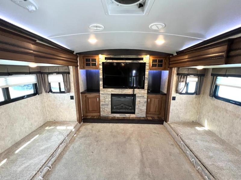 In front to the right of the main entry door head up the steps to a spacious front living area where you will find dual opposing slides. There is a slide out hide-a-bed to the right, and an L-shaped hide-a-bed sofa with connected recliner to the left. Along the front wall find a HDTV, and optional fireplace shown, plus so much more!