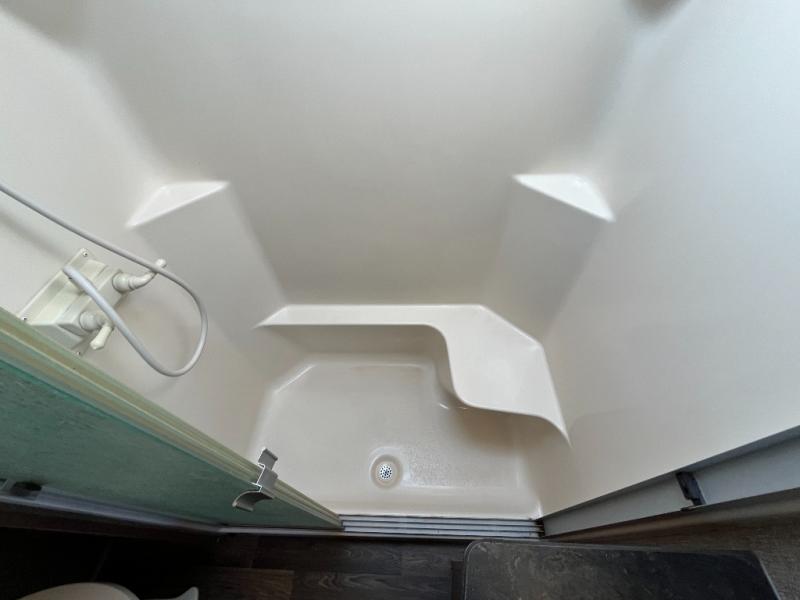 Head up the steps to the right of the door and find a side aisle bath on the left along with a handy closet just before the bathroom door. The bathroom features a spacious linen cabinet, toilet, a 48" x 30" shower including seat, and a vanity with sink.