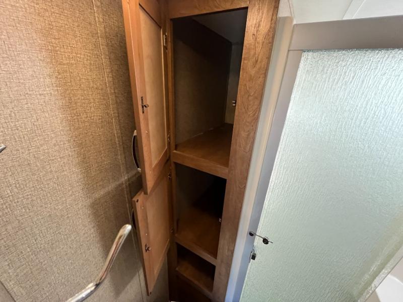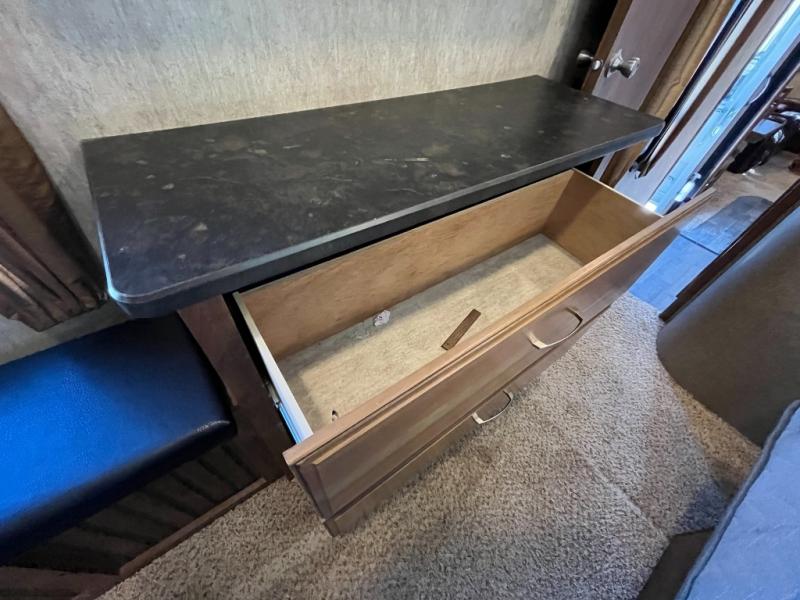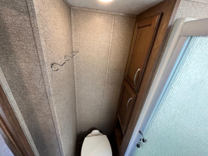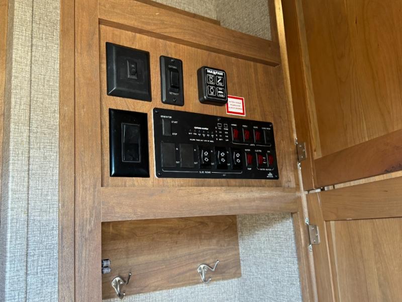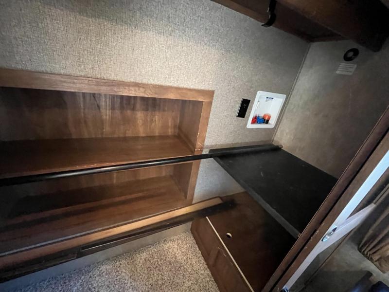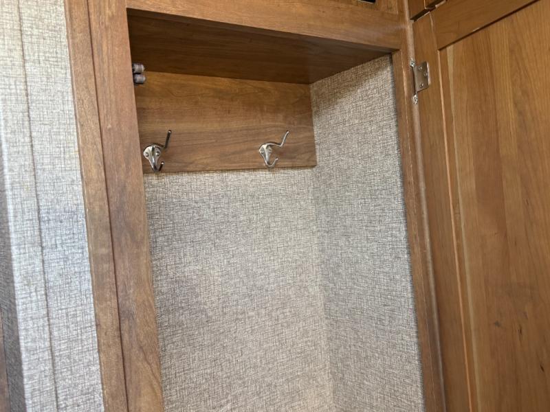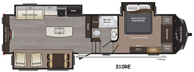The master bedroom at the front of this Montana High Country unit offers a slide out queen or optional king bed both with underneath storage for larger items like luggage or extra blankets. There is more storage found opposite the bed in the dresser, plus there is an HDTV above, and seating along side of it. The front wall features a wardrobe between washer and dryer prepped spaces, plus so much more!