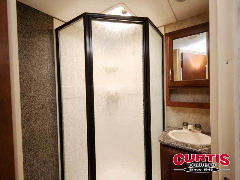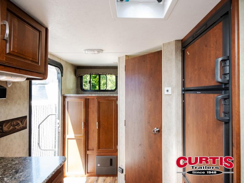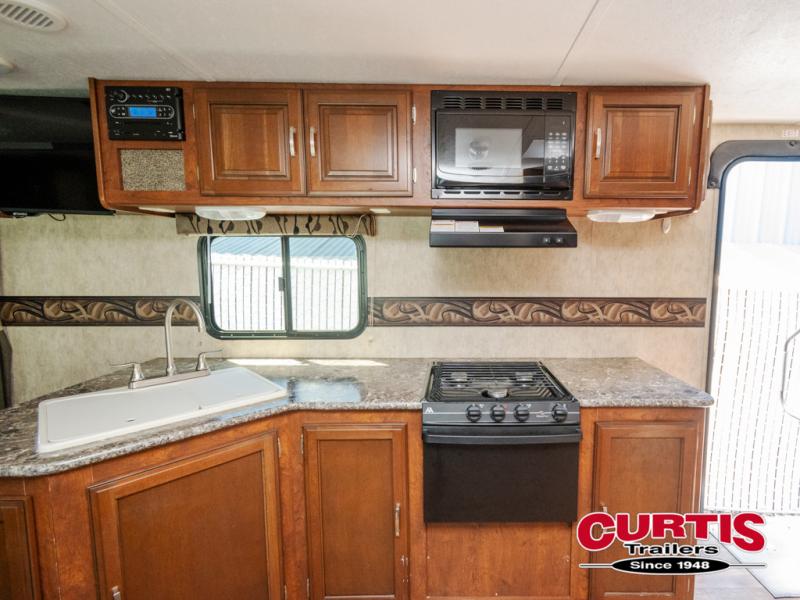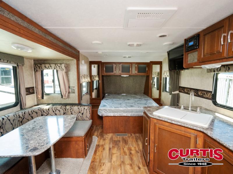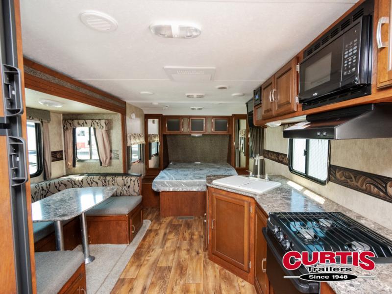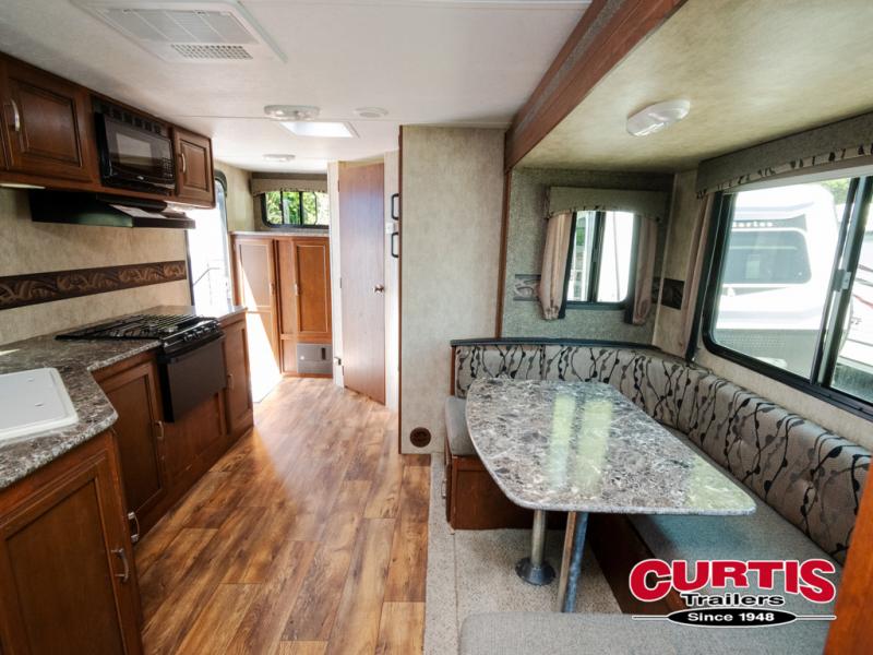 Opposite the kitchen area find a slide out u-shaped dinette which creates a bit more foot traffic space inside, plus the dinette can easily seat everyone for mealtime, and also can become a bed for two at night when needed.