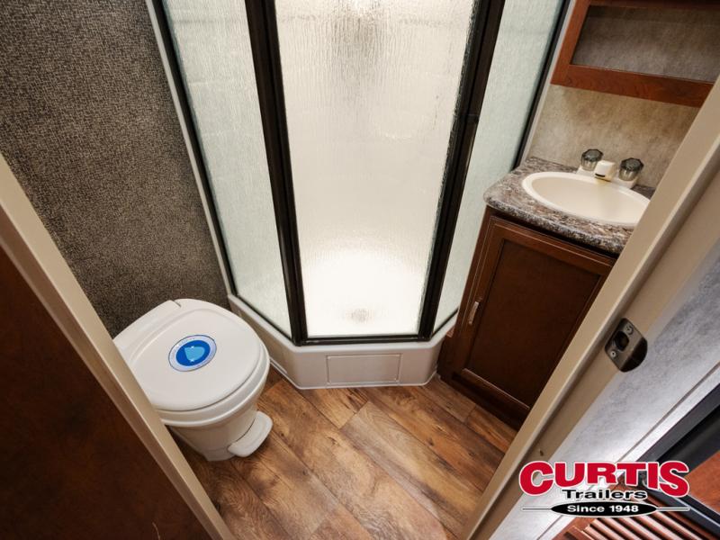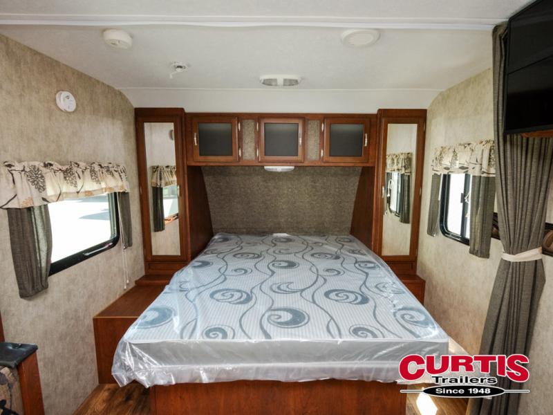 The front features a queen size bed with dual wardrobes and an overhead storage cabinet. There is a TV that can easily be viewed from the bedroom or the dinette.