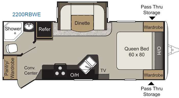 This Keystone Passport Grand Touring travel trailer model 2200RBWE features a rear corner bath and a single slide for added foot traffic space inside.