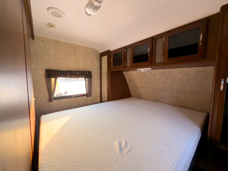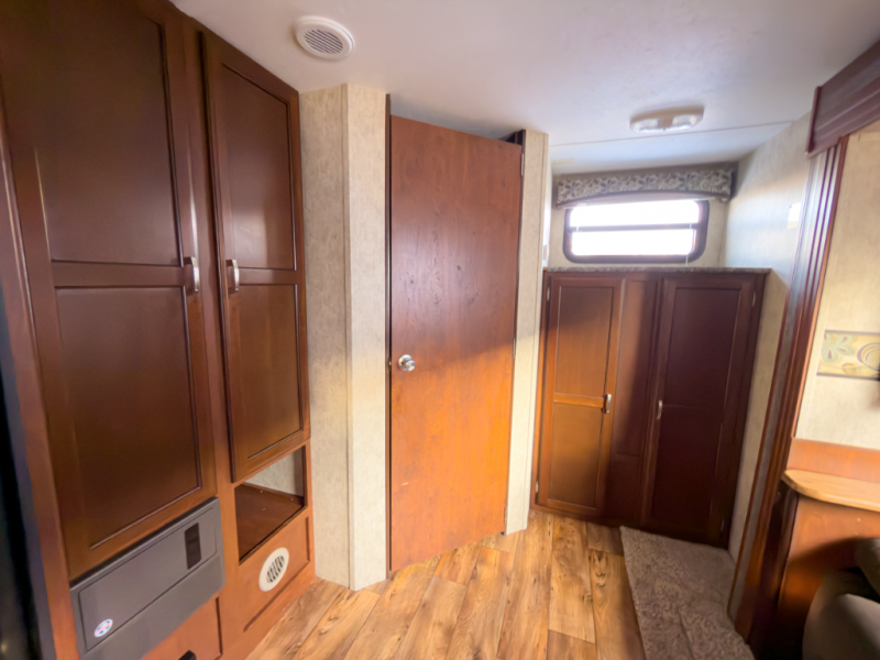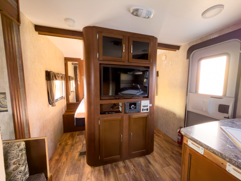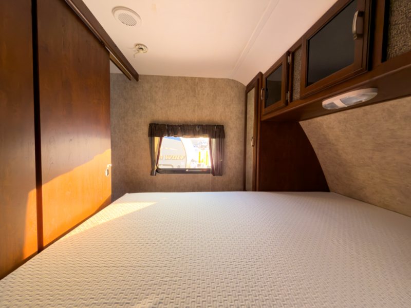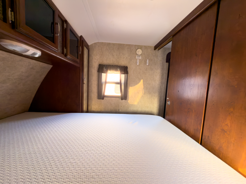 As you enter notice the front bedroom with queen size bed on your right. There are dual bedside wardrobes for storage, plus the overhead cabinets too. A convenience center is also located on the curbside bedroom wall. There is a swivel TV cabinet in the living area just off the foot of the bed which makes it easy to watch television from bed, as well as from in the main living space. Privacy curtains can be pulled on either side of the entertainment center cabinet.