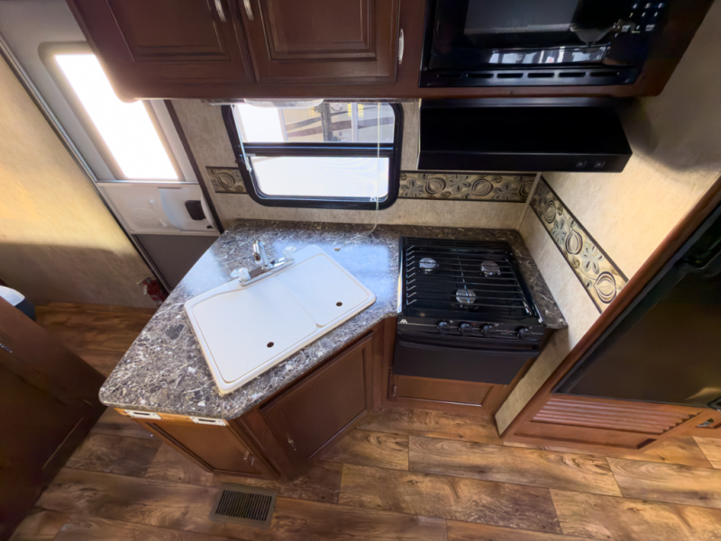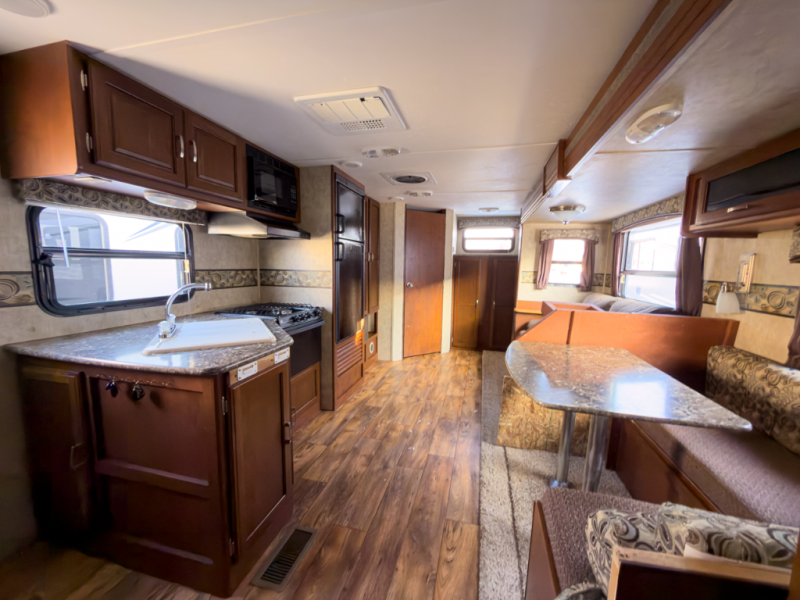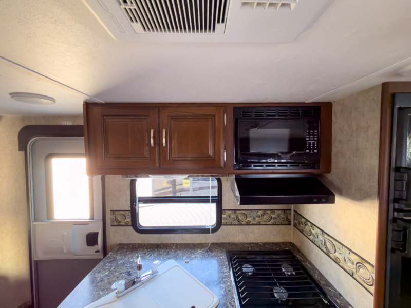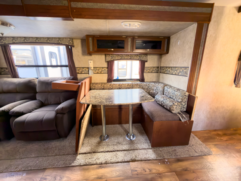 In the main living area enjoy the added space created by a large slide out u-shaped dinette and fold-down sofa. The sofa features overhead storage, and both can be made into additional sleeping space at night.