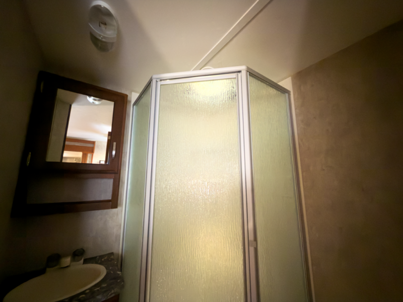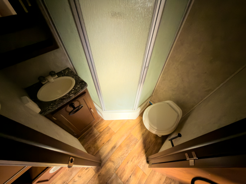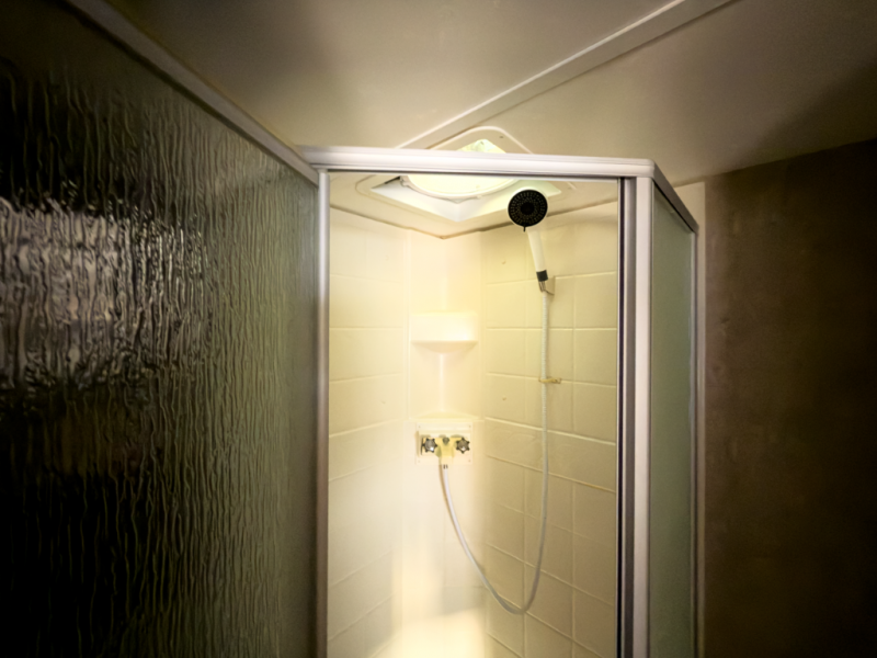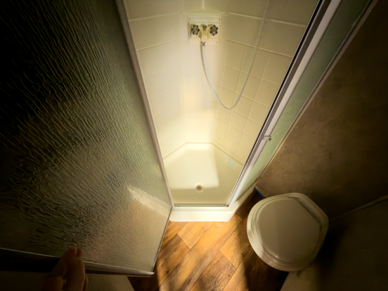 The rear corner features a convenient bath with angled shower, toilet and sink. Next to the bath in the opposite corner is a clothing wardrobe.