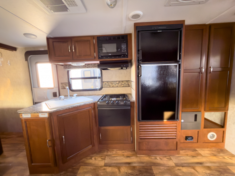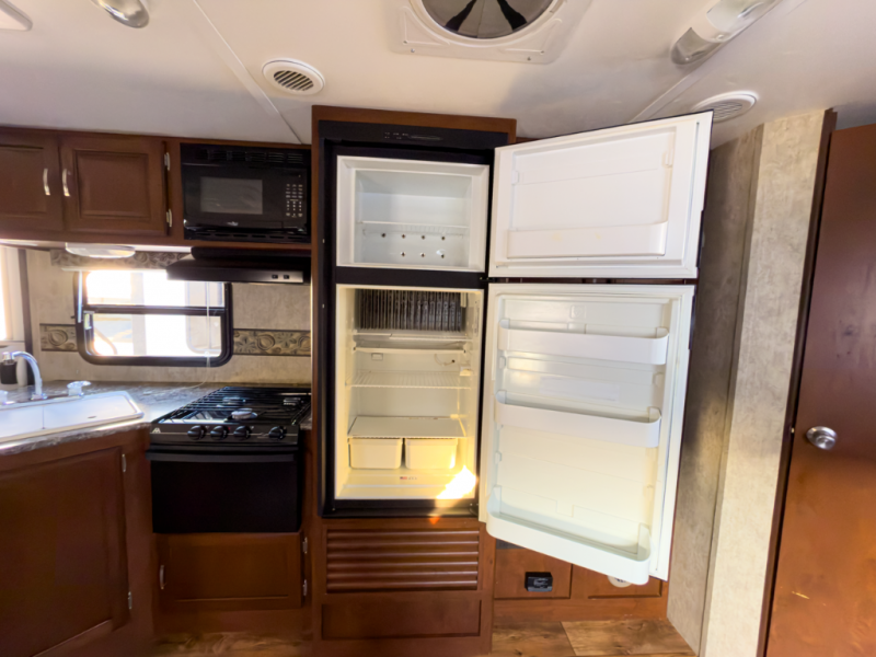 On the opposite side to the left of the entry door find all the kitchen appliances needed to create light meals and snacks for your family. There is a double kitchen sink, three burner range, refrigerator, and double pantry/wardrobe that can be used to store dry goods or clothing whichever you choose.