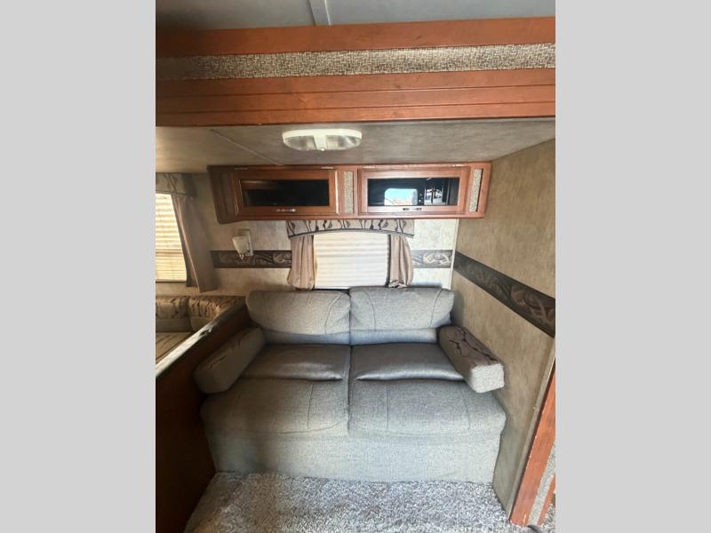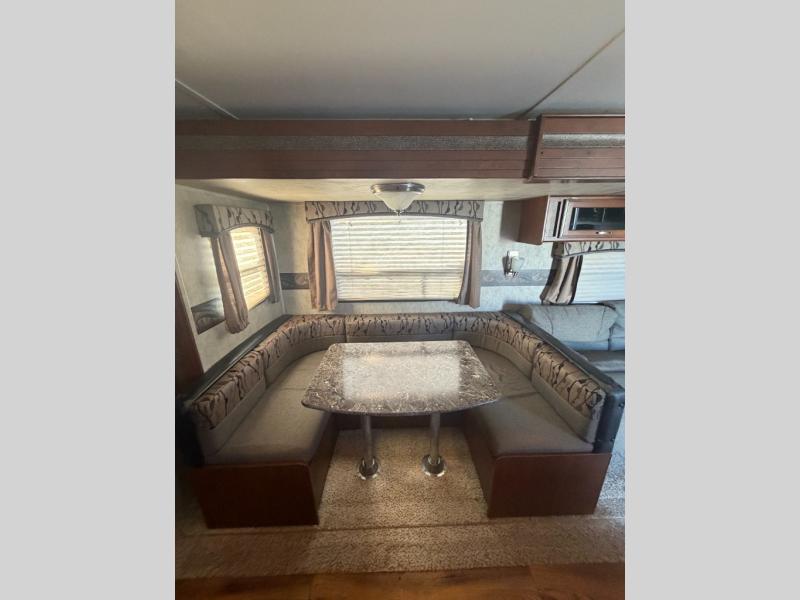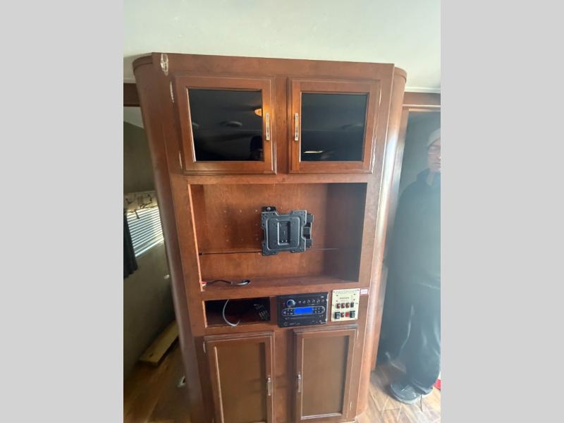 Opposite the door side find a slide out u-shaped dinette and fold-down sofa with overhead storage. The dinette and sofa can both be made into additional sleeping space for overnight guests. A nearby entertainment center along the interior living room wall can easily be viewed by any seating in the room.