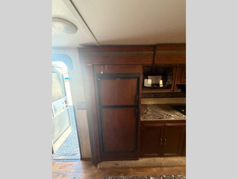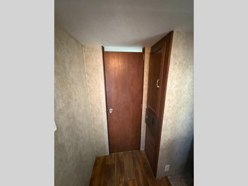 At the back of this 2770RB Grand Touring Passport trailer you will find plenty of storage for your things with a pantry adjacent to the slide out, and a wardrobe just outside the bathroom door.