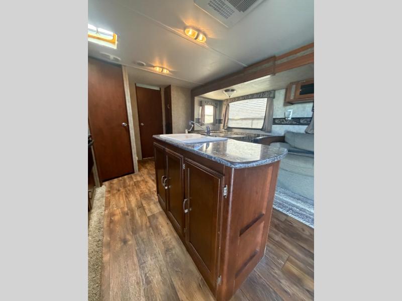 As you enter you will enjoy the spaciousness that you see. With dual opposing slides in the main living area it creates an open concept feel. There is a refrigerator, counter space, and three burner range slide out just to the left of the entry door. A convenient kitchen island with double sink is just off center and provides a bit more prep space and easy cleanup.