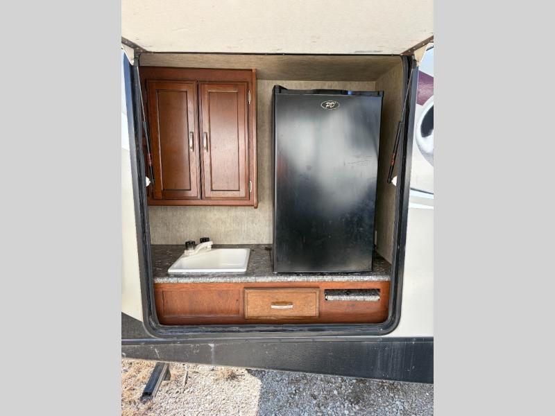 On the outside find a rear outdoor kitchen with single sink, counter space, and refrigerator. There is also some overhead storage as well. In the front find a spacious pass-through compartment for all of your outdoor camping gear, plus so much more!