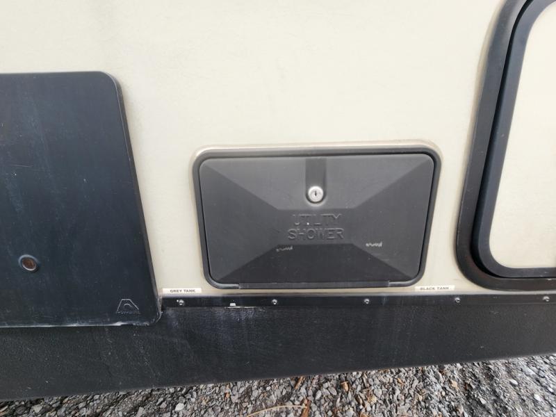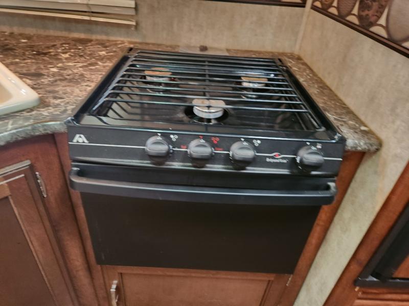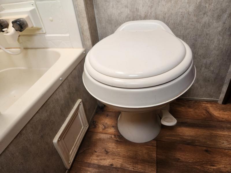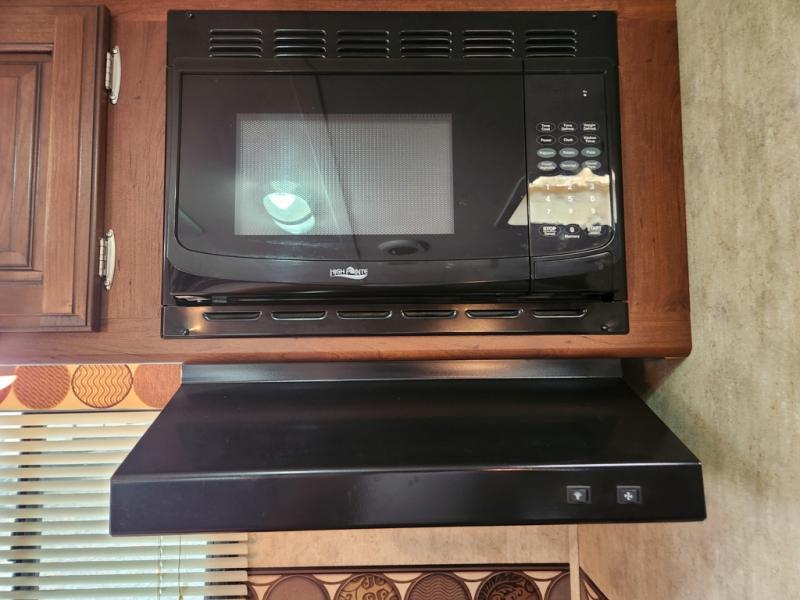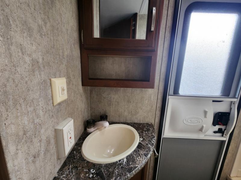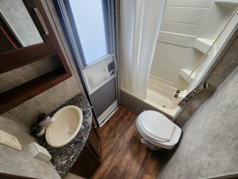 The entertainment center is centrally located in the main living space and can be easily viewed by any seating in the room. There is a large slide out u-shaped dinette for mealtime, and a fold down sofa for added seating, plus each can be quickly made into more sleeping space at night if needed. The sofa also offers overhead storage.