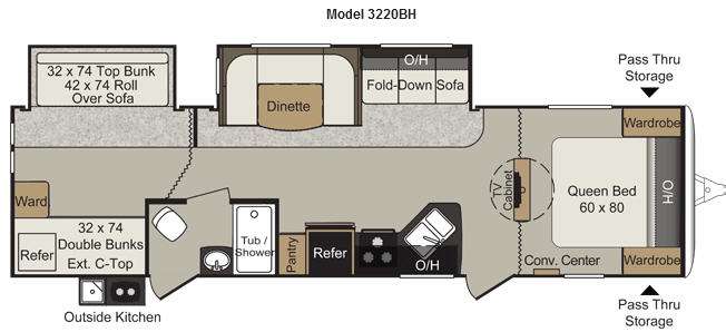 You won't have any trouble taking along a few extra friends in this Passport Grand Touring trailer by Keystone RV. Model 3220BH offers quad bunks, dual slides for added space, two entry doors, and a convenient outside kitchen!