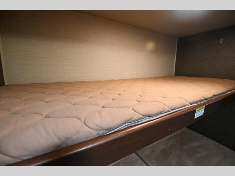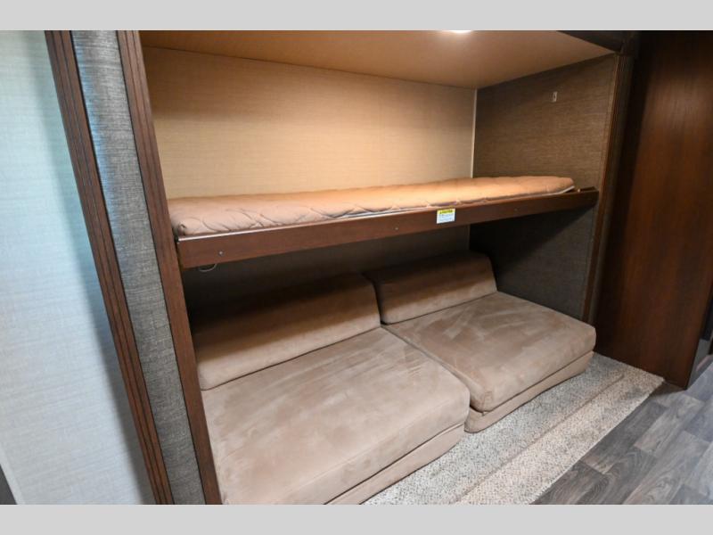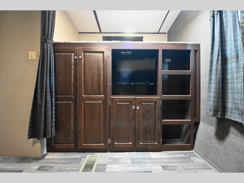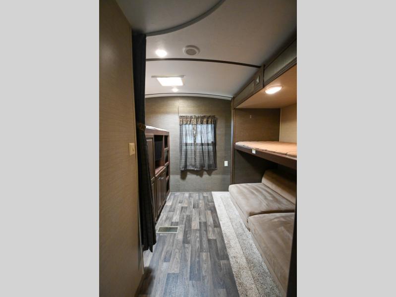 The rear bunkhouse provides sleeping for four with a slide out bunk bed including two trundle beds below, and a fourth bunk above cabinets and a wardrobe area on the opposite side.