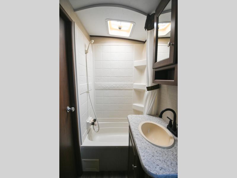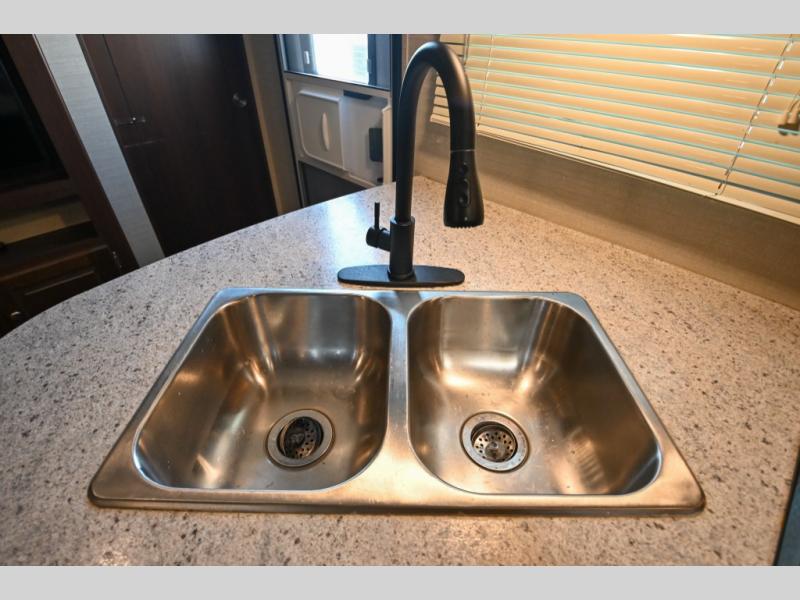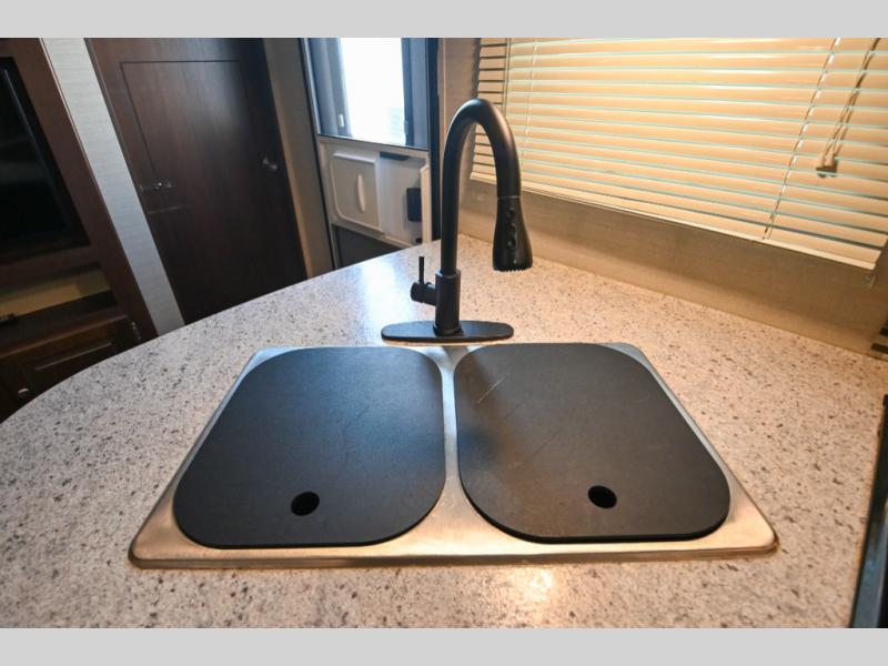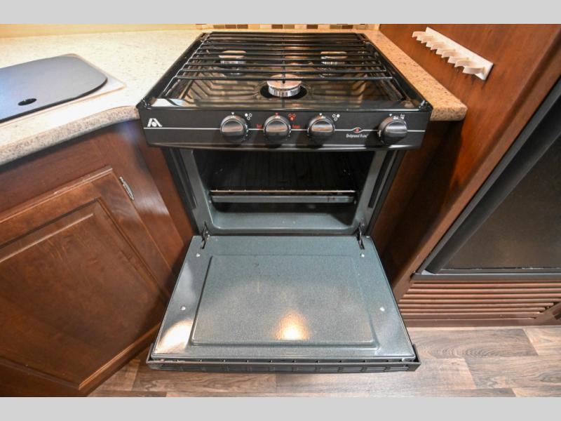 Make all your meals and snacks while traveling easy in this Premier kitchen. There is a second pantry for storage, a refrigerator, three burner range, and large kitchen sink for easy cleanup. Plus there is an overhead cabinet for dishes and things.