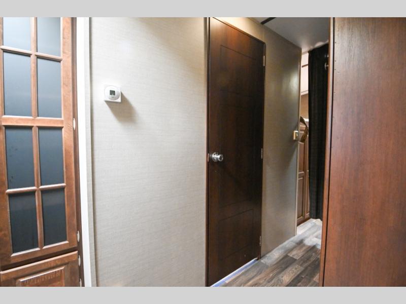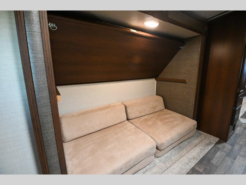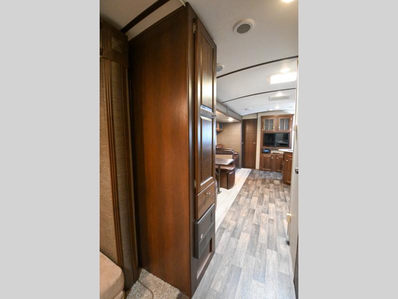 Step inside the entry door closest to the front and see the queen bed with wardrobes, overhead cabinet, and laundry chute. There is an entertainment center off the foot of the bed and two pocket doors can be closed for more privacy at night.