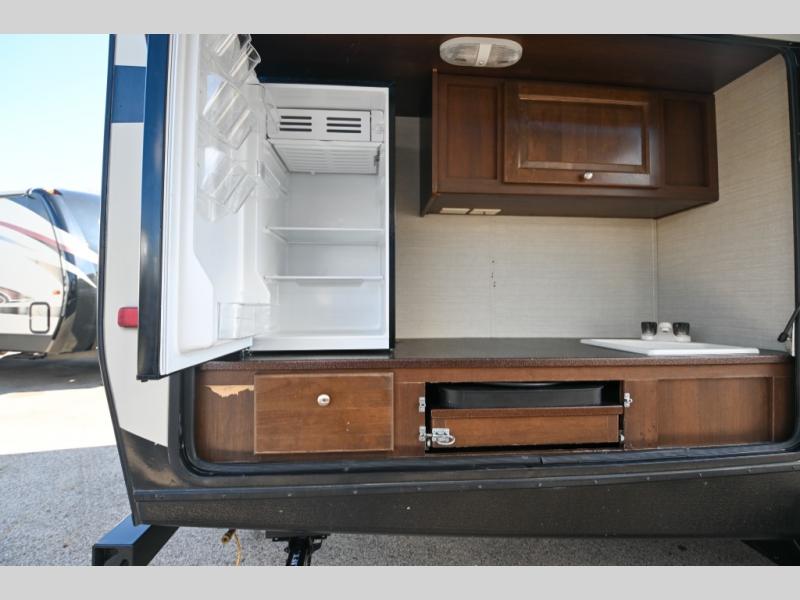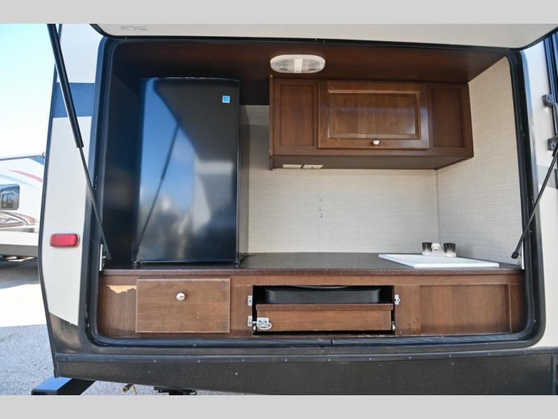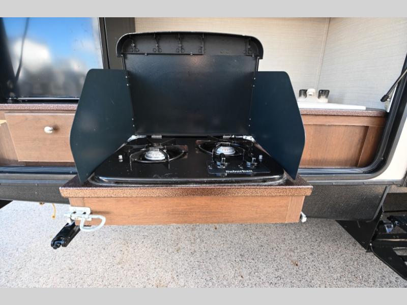 There is also an outdoor camp kitchen that you will love if you enjoy cooking and dining outside. There is a refrigerator, single sink, overhead storage, counter space, and a swing out cook center with two burner stove.