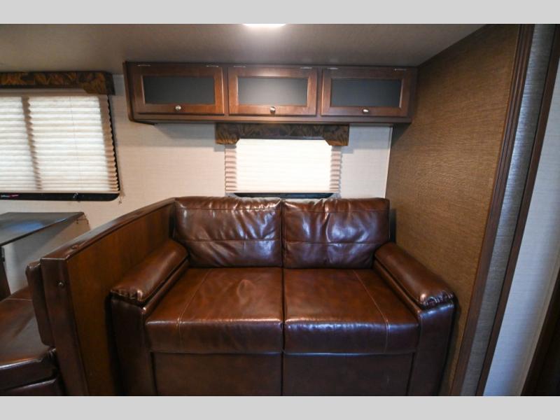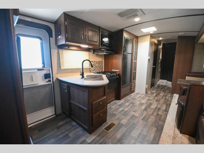 The combined kitchen and living room space feature a large slide out tri-fold sofa and booth dinette. There is a pantry and wardrobe found off to the side of the dinette for storage, and the rest of the kitchen amenities are on the opposite side.