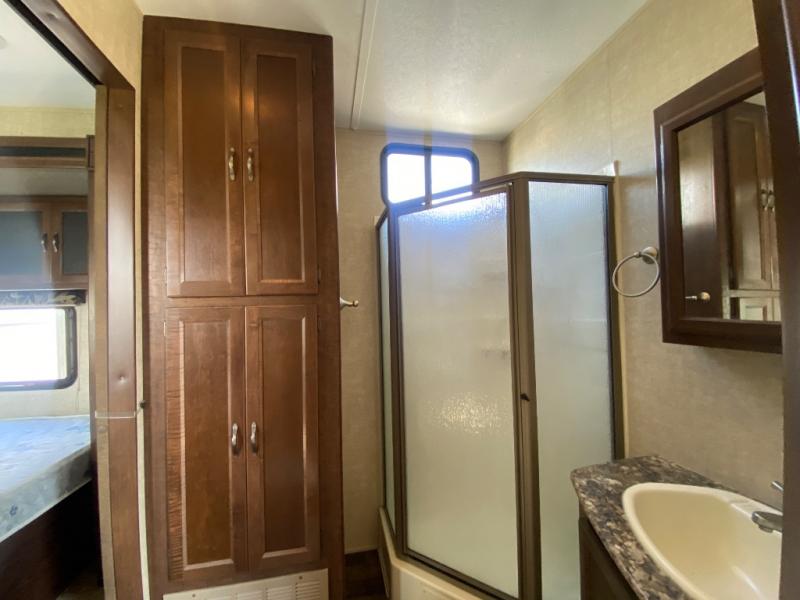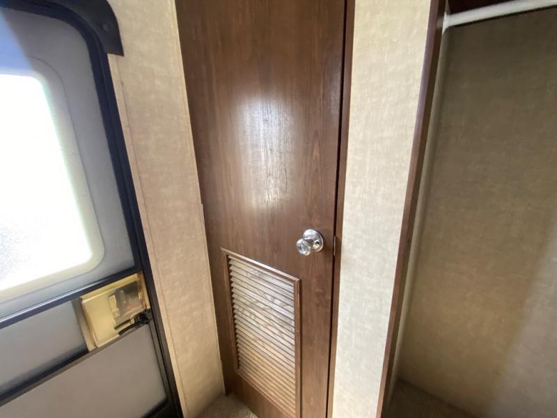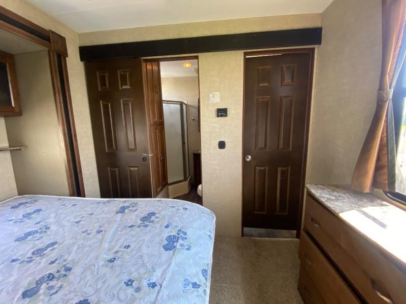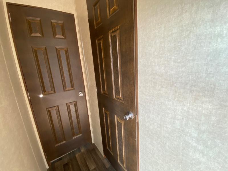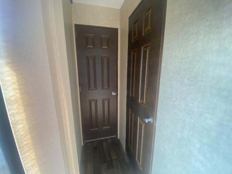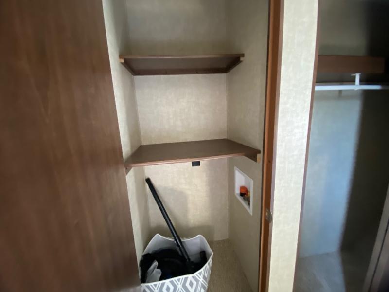 The rear bedroom features a slide-out king bed with overhead storage. There is a vanity with drawers, wardrobe with sliding doors, and closet with washer/dryer prep for added convenience. Enjoy the private entry into the bedroom from outside, and so much more!