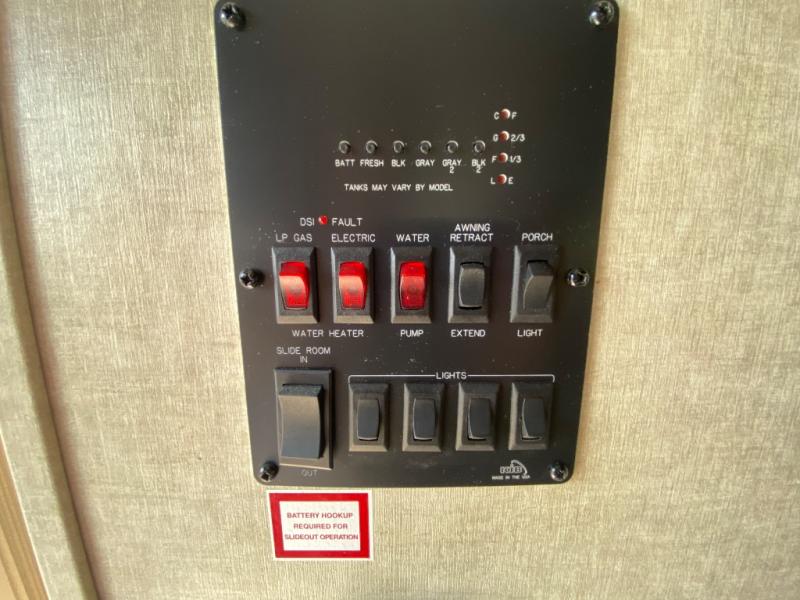 The slide on the opposite side features all the kitchen amenities you need to prepare and cook food for yourself and your guests. There is a refrigerator, three burner range, counter space, and pantry. The slide also features an entertainment center with LCD TV for viewing from any seating in the space.