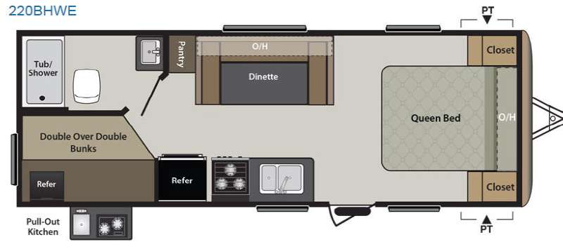 On the outside you will enjoy the amount of storage space with the front pass-through compartment for all of your outdoor camping gear. There is also an outdoor kitchen for the chef in the family to enjoy. You will find a refrigerator, pull-out single sink, and two burner cook-top, plus so much more!